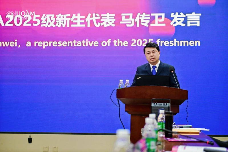 接着,中加国际MBA2023级学员、徐工集团总经理孙雷代表校友分享了自己在中加国际MBA学习生涯中的收获,并给予了新同学们要积极参与课堂、加强同学交流、树立终身学习的理念,以及珍惜学习时光等几点建议。2025级新生代表马传卫、饶薇分别发言。他们感谢学校和老师们为我们提供了继续深造的平台,并代表新生承诺将珍惜学习机会,与同窗携手共创更有价值的未来。最后,出席会议的领导和老师为新生代表佩戴校徽,并合影留念。