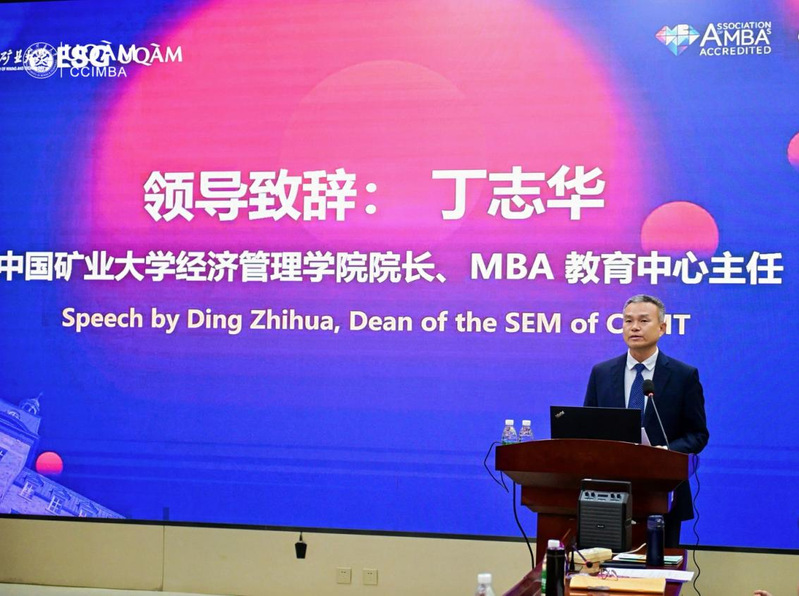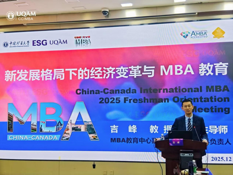 2025年12月28日上午,中加国际MBA2025级开学典礼于经济管理学院B117报告厅隆重举行。中国矿业大学经济管理学院党委书记李新春,院长、MBA教育中心主任丁志华,加拿大魁北克大学EMBA项目主任Kamal Bouzinab教授(线上),中加国际MBA项目协调人、加拿大魁北克大学那士荣教授(线上),中国矿业大学国际合作交流处副处长权学红,经济管理学院副院长江红艳、王德鲁、冉洪涛,国际事务办公室主任王帮俊,学科与人才办公室主任陈飞宇,以及项目教师代表孙自愿、曹庆仁、芈凌云、刘建勇等出席典礼。典礼由MBA教育中心副主任、MBA学科负责人吉峰教授主持。