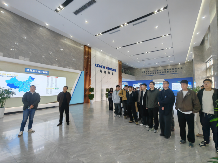 上午 ,师生一行先后抵达宿州海创环境能源有限责任公司及灵璧海创环境科技有限责任公司。在企业负责人的陪同下,大家先后参观了企业展厅、中央控制室及生产现场,通过项目分布图、工艺流程图和实时监控大屏,直观了解了固废处理、资源循环利用、清洁能源供给等核心业务流程与运营模式,深刻感受绿色环保、循环高效的产业发展理念。